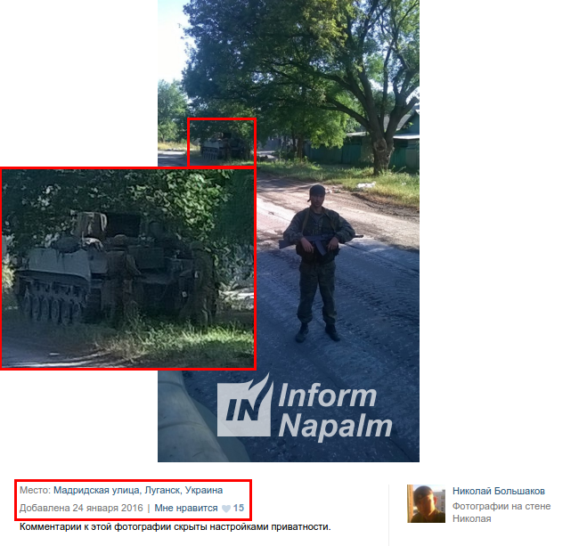 Еще одна фотография, которая подтверждает пребывание Большакова на территории Луганской области, сделанная на пересечении улиц Мадридская и Чернышевского в городе Луганск. Как видим, на заднем плане виднеется БМД или самоходная артиллерийская установка 2С9 «Нона-С».