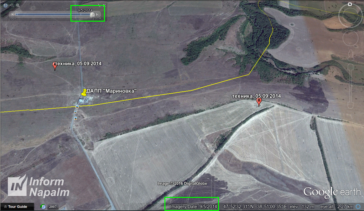 «Для этого мы проведем анализ снимков сервиса GoogleEarth с украинско-российской границы начала сентября 2014 года. Спутниковый снимок сервиса GoogleEarth, датированный 04.09.2014, маркерами помечено размещение военной техники на территории РФ в непосредственной близости от украинской границы и пограничного пункта ДАПП Мариновка. За посадками размещено двадцать четыре единицы техники. Желтой линией обозначена государственная граница», - описывают фото волонтеры.