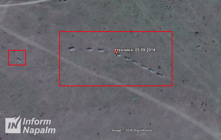 «Интересен тот факт, что сервис GoogleEarth содержит в истории снимок, датированный 05.09.2014, который, предположительно, был сделан на следующий день после указанного выше спутникового снимка. На нем в точке А (47°52’6.88″N  38°51’18.66″E) мы видим колонну из десяти единиц военной техники, которая свернула на северо-запад от КПП Марьинка и движется в глубь территории Украины. Предположительно, в колонне движется один военный грузовик и восемь боевых машин, девятая машина скорее всего находится в дозоре и прикрывает продвижение колонны», - комментируют фото эксперты.