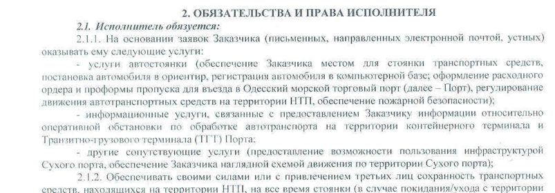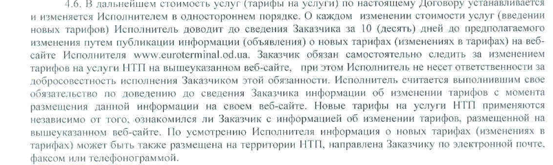 Следующий пассаж из договора: «поставщик «услуги» имеет право в безусловном порядке, односторонне изменить цену договора, просто известив транспортника за 10 дней до начала действия новой цены. А может и не известить, т.к. в договоре указано, что это — обязанность клиента Одесского порта ежедневно просматривать вэбсайт «платного шлагбаума порта» с тем, чтобы следить за последними новинками в ценообразовании шлагбаума ...