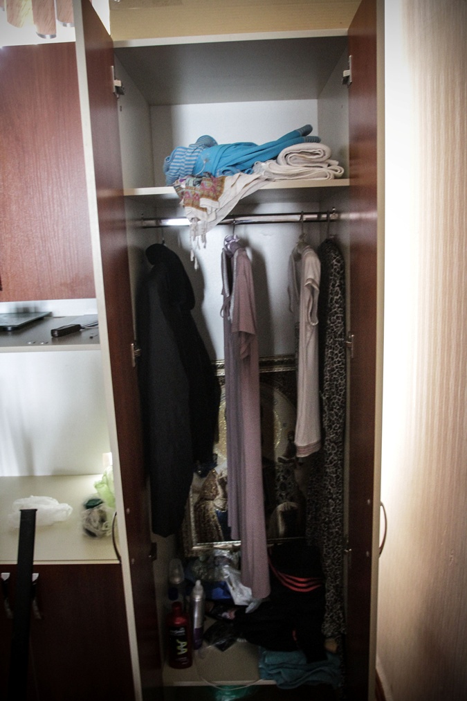 Действительно пахнет приятно. Сама комната не большая. У двери кровать. Окно заставлено столами, в шкафу - женские платья. На фотографиях за платьями можно рассмотреть икону, прислоненную к стене шкафа.