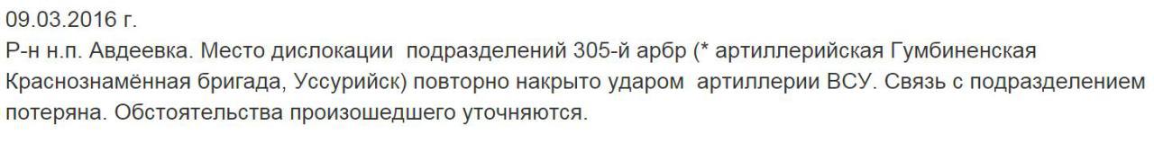 Сообщается, что потери 305 артбригады, которая дислоцируется в Уссурийске, достигают 16 убитыми и 28 ранеными. В числе погибших и.о. начальника штаба подразделения. В свете таких потерь в рядах подразделения началось дезертирство в рядах российских войск, которое пришлось останавливать силой.