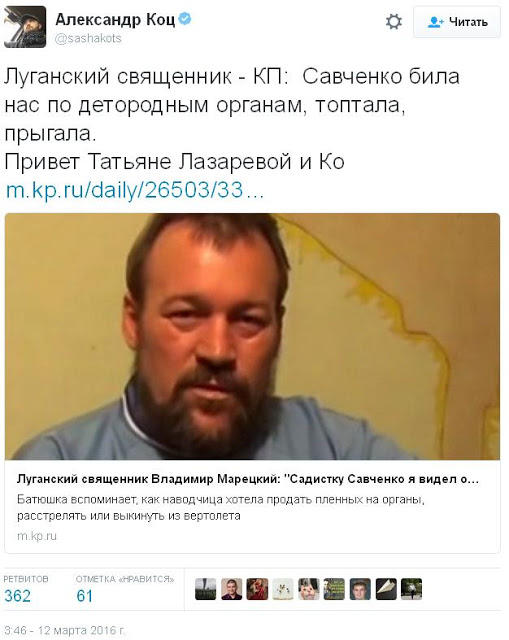 Теперь эти двое "горе-журналисты" перебравшись в новую горячую точку Земли - Сирию, кстати, где, как и в Украине воюют ВС РФ. И неожиданноло они начали раскручивать новую "горячую новость". Надежда Савченко издевалась над пленным священником.
