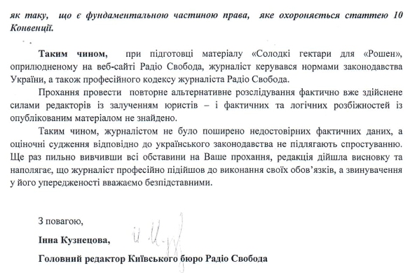 Ми підготували разом з медіаюристами та юристами з земельного права розгорнуту аргументовану відповідь “Рошен”, за підписом та затвердженням головного редактора українського бюро “Радіо Свобода” Інни Кузнецової».