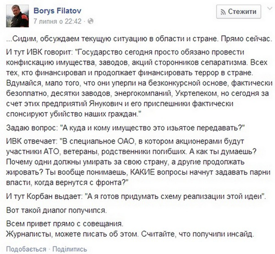 Зокрема, такі настрої панують у Дніпропетровській обладміністрації. Про необхідність реалізації подібних планів недавно на своїй сторінці у Facebook писав заступник голови дніпропетровської ОДА Борис Філатов.