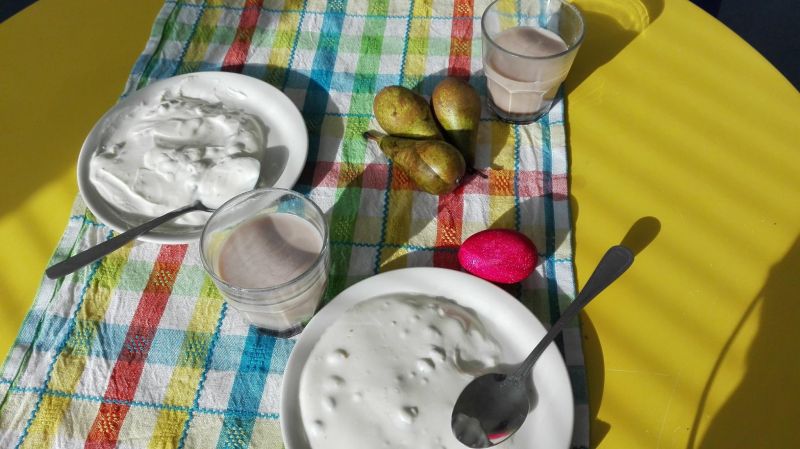 Утром, нам приносят завтрак. Мы кушаем 3 раза в день + 2 раза пуддинг или фрукты. Сегодня пасха и нам приносят пашу и прекрасные красные-фиолетовые яйца.