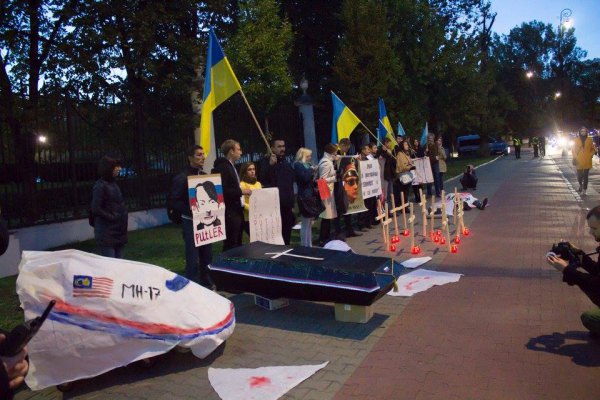 7.10.2015. Акція українських активістів під Посольством РФ у Польщі. За "труну для Путіна" Наталці Панченко загрожує 3 роки позбавлення волі. З відповідною заявою до правоохоронних органів Польщі звернулися проросійські активісти. (Фото з ФБ-сторінки Euromaidan-Warszawa)