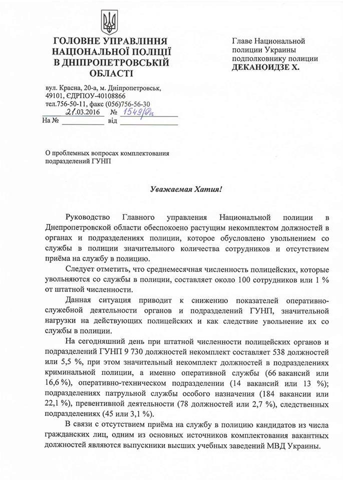 Начальник Главного управления Нацполиции в Днепропетровской области Игорь Репешко написал Хатии Деканоидзе письмо о том, что «руководство обеспокоено растущим некомплектом должностей», — пишет strana.ua