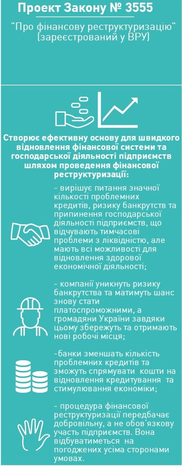 Благодаря законопроекту будет создана эффективная основа для решения проблемы долговой нагрузки на украинские предприятия, имеющие временные проблемы со своевременным погашением долгов перед кредиторами.