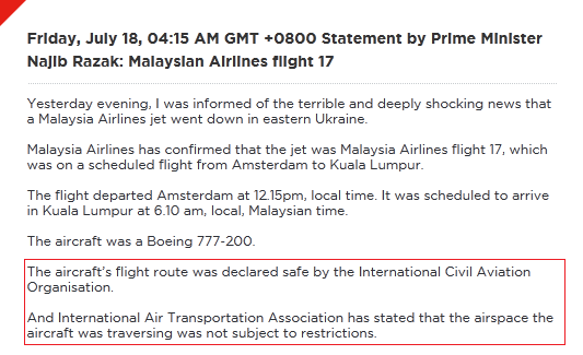Кроме того, в своем официальном пресс-релизе Малазийские авиалинии неоднократно подчеркивали, что выбранный для полетов маршрут был признан всеми профильными организациями безопасным для полетов. Вот часть обращения премьер-министра Малайзии Наджиба Разака, размещенного на сайте Малазийских авиалиний: