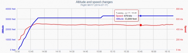 В этом утверждении правда лишь то, что самолет летел ниже предполагаемых 35 тыс. футов, а именно на высоте 33 тыс. футов. Также правда то, что украинские диспетчеры предписали ему двигаться именно на этой высоте. Однако они не снижали его, как утверждают некоторые СМИ — если взглянуть на запись полета на сайте flightradar24.com, видно, что вначале самолет шел на высоте 31 тыс. футов, а над территорией Украины поднялся до 33 тыс.