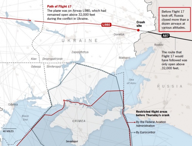 Маршрут над Украиной был признан международными организациями безопасным начиная с высоты 32 тыс. футов. Вот что по этому поводу пишет The New York Times: