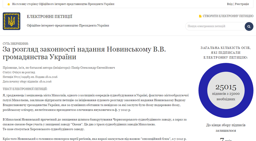 Электронная Петиция №22/019983 «За рассмотрение законности предоставления Новинскому В.В. гражданства Украины» набрала более 25 тысяч голосов и, согласно Закону «Про звернення громадян» № 393/96-ВР от 02.10.1996» должна быть рассмотрена Президентом Украины в двухнедельный срок.