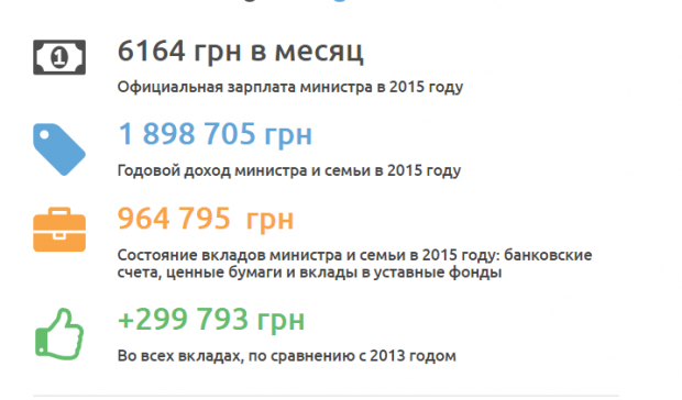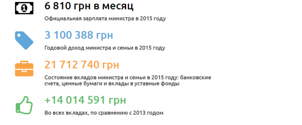 Но все эти трудности не только не сказались на благополучии министров и их семей, но и проходили на фоне их стремительного обогащения. Из всего Кабмина Яценюка, состоящего из 17 министров, лишь четверо задекларировали ухудшение своего финансового состояния, в то время как остальные отчитались про миллионные вклады и стремительный рост доходов, если не своих личных, то членов семей. Например, вклады в уставные фонды компаний, банковские счета и ценные бумаги экс-премьер-министра Арсения Яценюка возросли за время премьерства на 14 миллионов гривен.