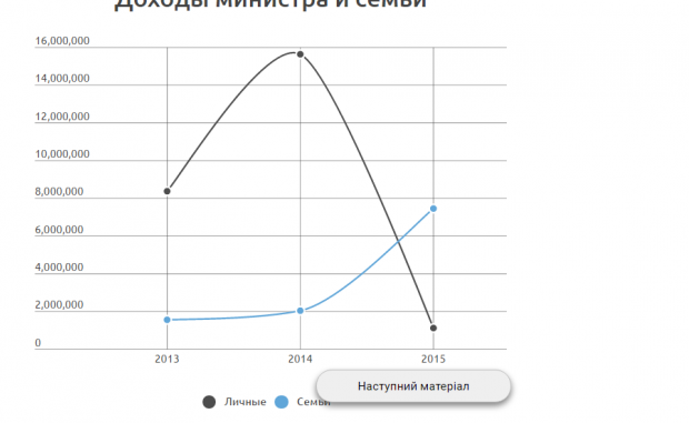 На графиках большинства членов правительства Яценюка прекрасно видна удивительная закономерность роста дохода семей топ-чиновников с 2013 по 2015 год. Наиболее показательным является график доходов сохранившего должность министра молодежи и спорта Игоря Жданова. На фоне двукратного падения его собственных доходов с 219 тыс. гривен в 2013 году до 99 тыс. в 2015-м, семья стала зарабатывать в 9 раз больше: 31 тыс. грн в 2013 году и 284 тыс. - в 2015 году.