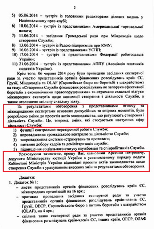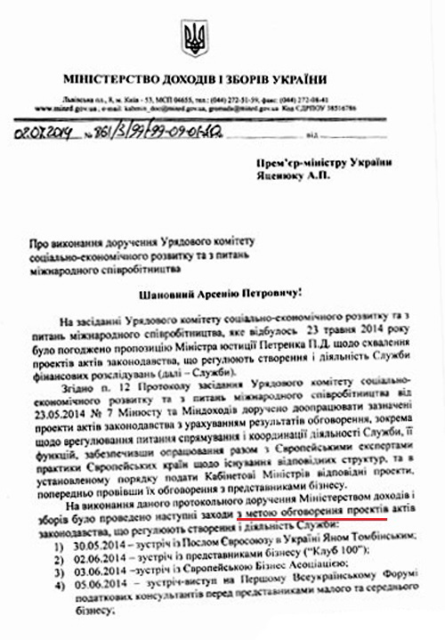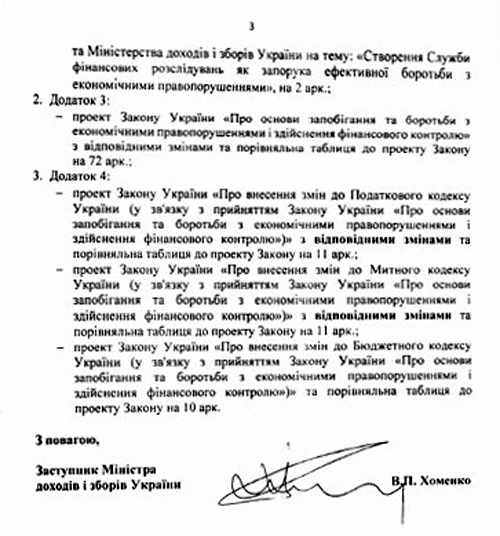 В своем письме на главу правительства Хоменко сообщает, что он полностью выполнил поручение заседания Правительственного комитета от 23 мая 2014 года №7. В документе Минюсту и Миндоходов поручено "доработать проекты актов законодательства с учетом результатов обсуждения, в частности относительно урегулирования вопросов направления и координации деятельности службы, ее функций, обеспечения проработки вместе с Европейскими экспертами практики европейских стран относительно существования соответствующих структур, и в установленном порядке подать Кабинету министров Украины соответствующие проекты, предварительно проведя их обсуждение с представителями бизнеса".