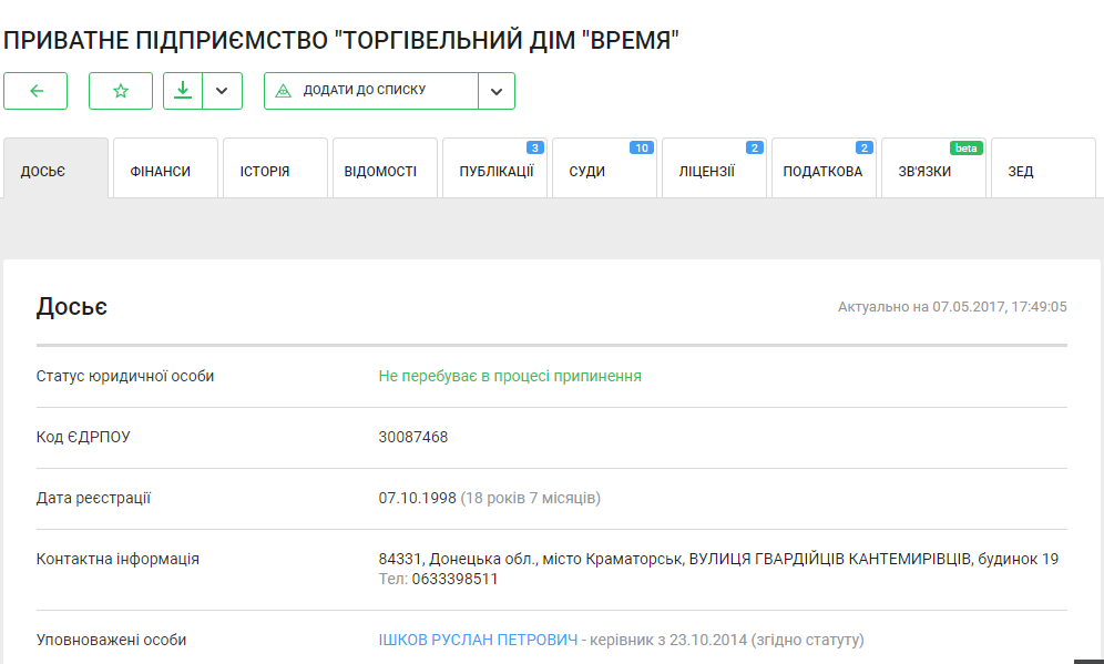 It should also be noted that another Valeriy Khomenko’s enterprise — PE "Trading House ’Vremya’" — was re-registered in Kramatorsk. The company’s authorized capital is over 42 million hryvnias, and the main activity of the company is trading in tobacco products.