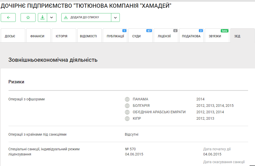 Until May 2015, the "Hamaday" tobacco company was also registered in Donetsk but was re-registered in Kramatorsk. However, the company’s licenses for tobacco product manufacturing could not be found.