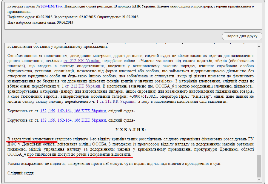 A case was opened for tax evasion, as the paper might have been used for illegal tobacco product manufacturing. Incidentally, the Mariupol judge then denied the investigators’ petition. No further decisions on this case were found in the registry.