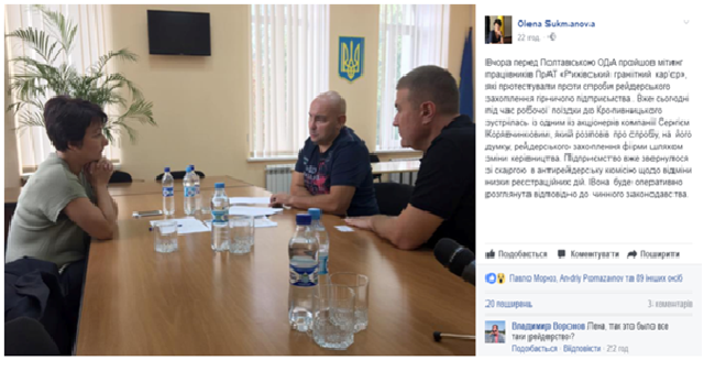 As previously reported by the media, Vadym Kovalchuk and Mykola Kovalenko are two accomplices in the seizure of a large granite quarry in the Poltava region. To seize the enterprise and scrap the equipment, they violated the company charter they signed themselves. They "threw" two other business partners - Serhiy Koryavchenkov and Serhiy Hilka, went to "pocket" registrars with a forged protocol of a covert meeting (forgery is under criminal investigation) of participants and "removed" the quarry’s management in August 2017, blocking its operations. But the attack on the quarry through black registrars was repulsed thanks to the intervention of the Ministry of Justice. The issue was personally monitored by Deputy Minister of Justice Olena Sukmanova. Here’s a screenshot of her post from last year.