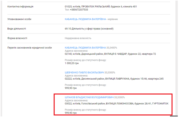 The lawyers are located next to the central office of the Ministry of Justice, where the Anti-raider Commission sits. But the most interesting fact in this context is that one of the founders of the law firm - with a stake of 33.3% - is Vladyslav Shpakov.