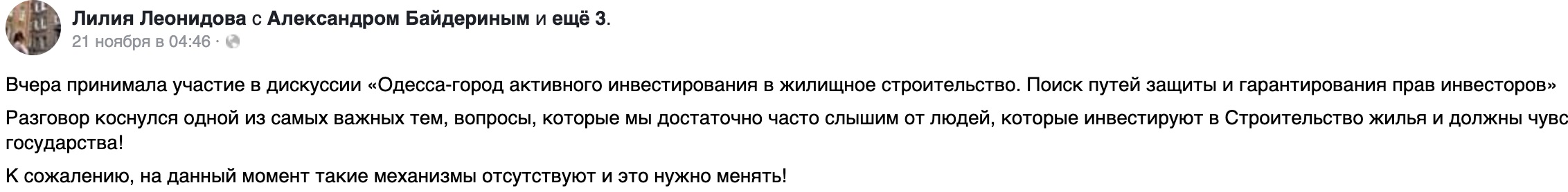 2) Several fictitious companies were created, such as the legal firm "Ky end Key," LLC "Odesa BTI," LLC "Right Project," LLC "Design and Architecture Studio ’Apelsin’," LLC "Documents," through which businessmen building millions of faceless uncomfortable concrete living meters in Ukraine were passed. No one was interested in the real state of housing projects, only the millions of dollars laundered by the Stolar, Plachkova, and Horovyi gang.