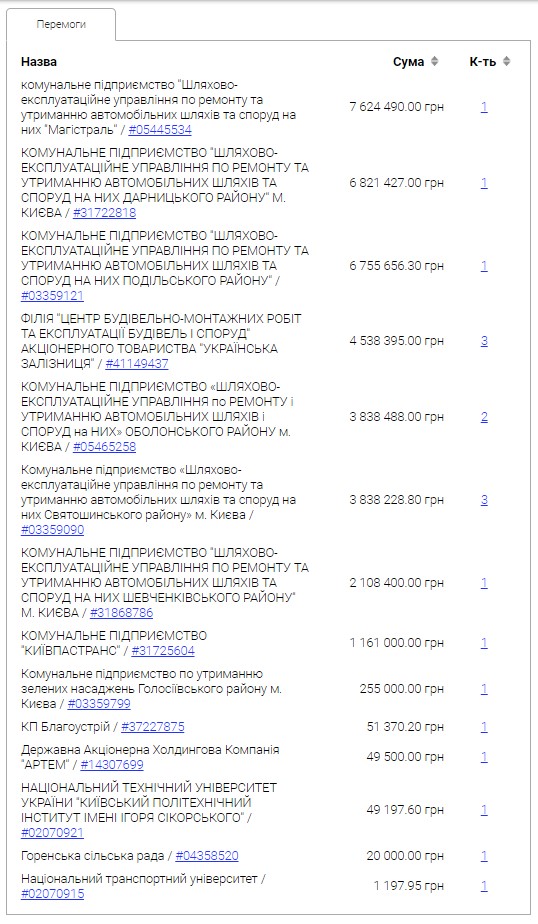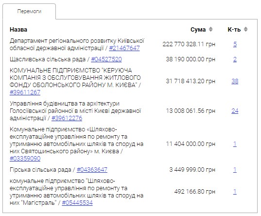 LLC "Modern Transport Infrastructure" is the winner in 96 procurements for road construction services totaling over 309 million hryvnias in Kyiv and Kyiv region (Department of Regional Development of Kyiv Region State Administration – 222.7 million hryvnias, Shchaslyve Village Council – 38.19 million hryvnias, Municipal Enterprise "Management Company for Housing Maintenance of Obolon District of Kyiv" – 31.7 million hryvnias, Construction Department of Holosiiv District of Kyiv – 13 million hryvnias, Hirska Village Council – 3.4 million hryvnias).