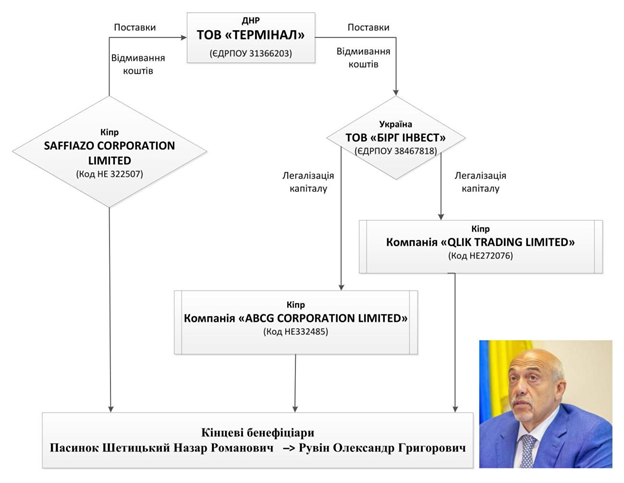 Through the company SAFFIAZO CORPORATION LIMITED (controlled by Ruvin) registered in Cyprus, it purchases fuel materials from Russia and resells them in Ukraine. The scheme is as follows: the company from Cyprus, SAFFIAZO CORPORATION LIMITED, purchases petrochemical products, gas-processing products: LPG (liquified petroleum gas), diesel fuel, gasoline, technical methanol, NGL (natural gas liquids) from companies in the Russian Federation and resells them to Ukrainian companies also controlled by the Ruvin family, making the Russian fuel appear to be from Cyprus.
