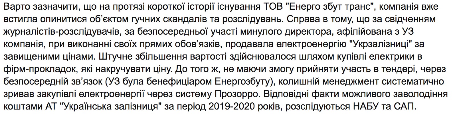 According to official sources, due to the activities of Yuriy Momot, the head and sole signatory of "Zbut Energy Ltd.", the company became one of the subjects of a high-profile investigation by NABU and SAPO initiated regarding the facts of possible embezzlement of JSC "Ukrzaliznytsia’s" funds during the period from 2019-2020 in the amount of 1.9 billion hryvnias.