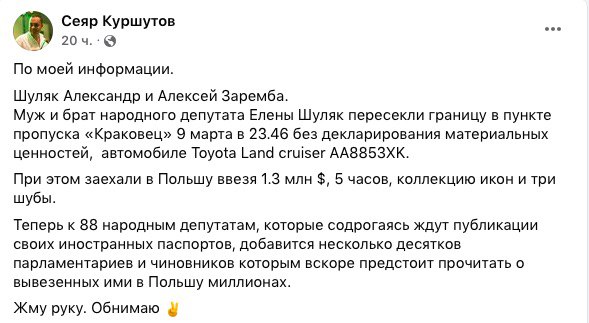 Both of them, despite the general mobilization, left the country at the beginning of March. Businessman Seyar Kurshutov reported this on his Facebook, citing his own sources. At the same time, the relatives of the main "servant" took with them 1.3 million dollars in cash, antique icons, and three fur coats. By the way, there have been no denials from Shulyak herself or the State Border Guard Service on this matter.