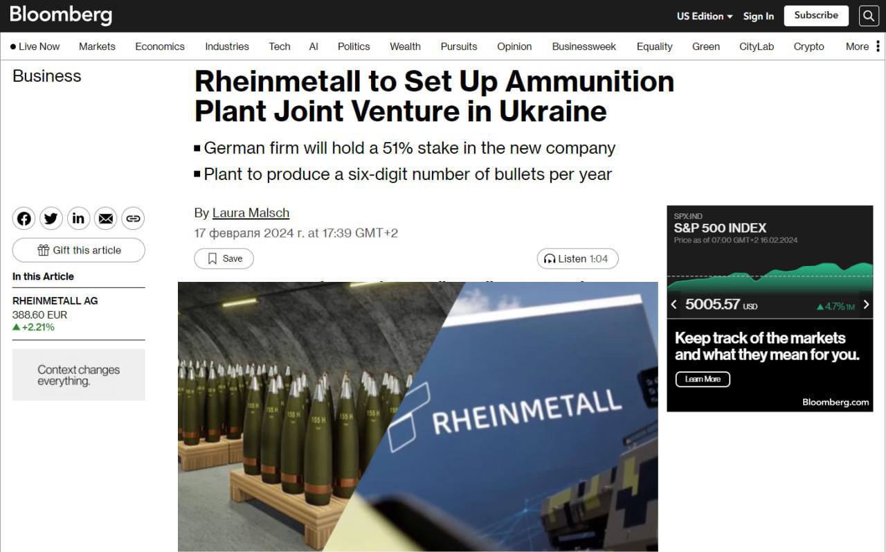 The plant will produce a six-figure number of shells per year. The timing is unknown. Let us remind you that Ukraine already has a joint venture with the German defense concern Rheinmetall for the maintenance and repair of equipment.