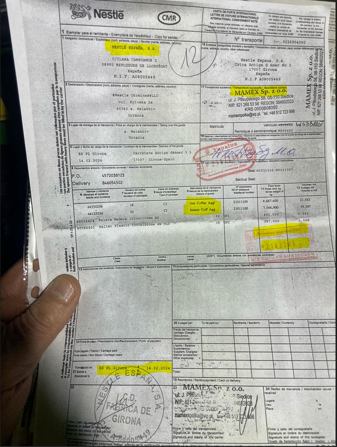The documents of one truck fell into my hands. The cargo is in no way humanitarian - almost 14 tons of Nestle coffee, which was loaded in the city of Girona, Spain on February 14, and on February 21 the truck received a mark to clear customs in Yagodyn. And this despite the fact that the queue time for our drivers is a couple of weeks.