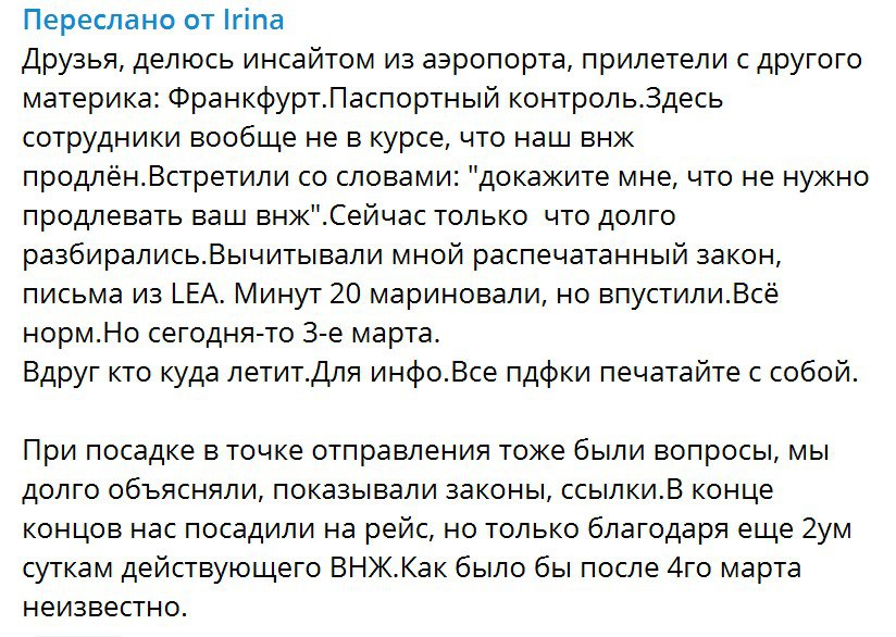 Another reports that at Frankfurt airport, after arriving in Germany, employees demanded proof that the residence permit did not need to be extended.