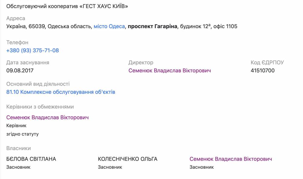 Denys Horlenko, with the help of other criminals, created a service cooperative, Guest House Odessa, through which he collected money. The founders were Svitlana Byelova and Olha Kolesnichenko. These people are involved in the creation of the OK "Guest House Kyiv" with director Vladyslav Semenyuk and the housing complex "Guest House UA" with director Rodion Cherney (also owners Vyacheslav Barbotko, Olexiy Luchenko). Denys Horlenko also created the Water City company in Odesa with activities in the field of purchase and sale of his own real estate.
