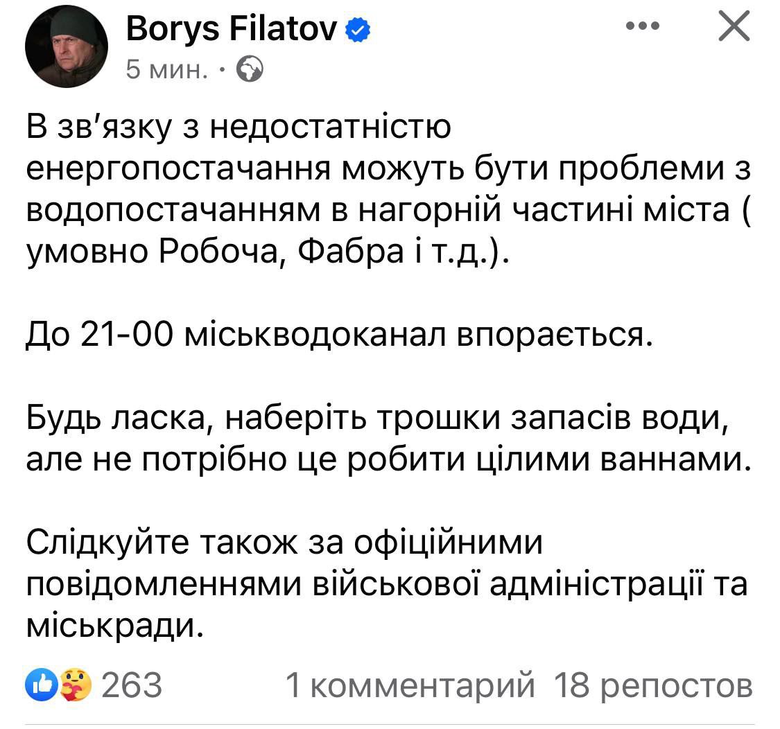 “There may be problems with water supply in the mountainous part of the city,” said Mayor Borys Filatov.