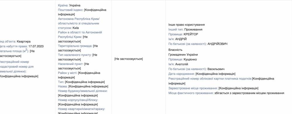 State Consumer Service official Kreitor officially does not have his own real estate. He declared that since 2021 he has been using an apartment of 62.5 square meters in Odesa. m, registered to Alla Stambirska. In June 2023, the official indicated that he was living in Kyiv for free in the apartment of his wife’s father, Anatoliy Kushchienko. We do not know with what funds the woman’s father purchased this property, but NAPC and NABU will look into this. The official did not indicate another property that the family uses (more on this later),