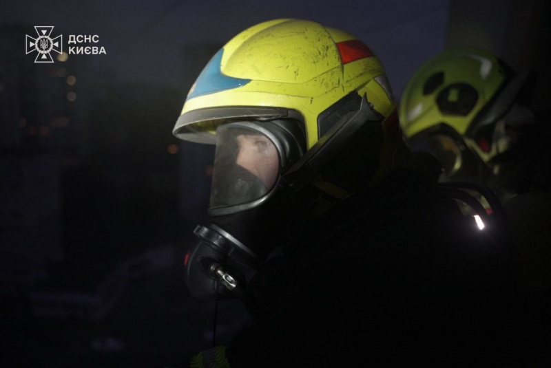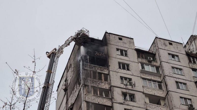 The State Emergency Service announced the extinguishing of the fire caused by the enemy attack in the Svyatoshynskyi district of the capital on the 16th floor, as well as partial destruction in the apartments on the 15th and 16th floors.