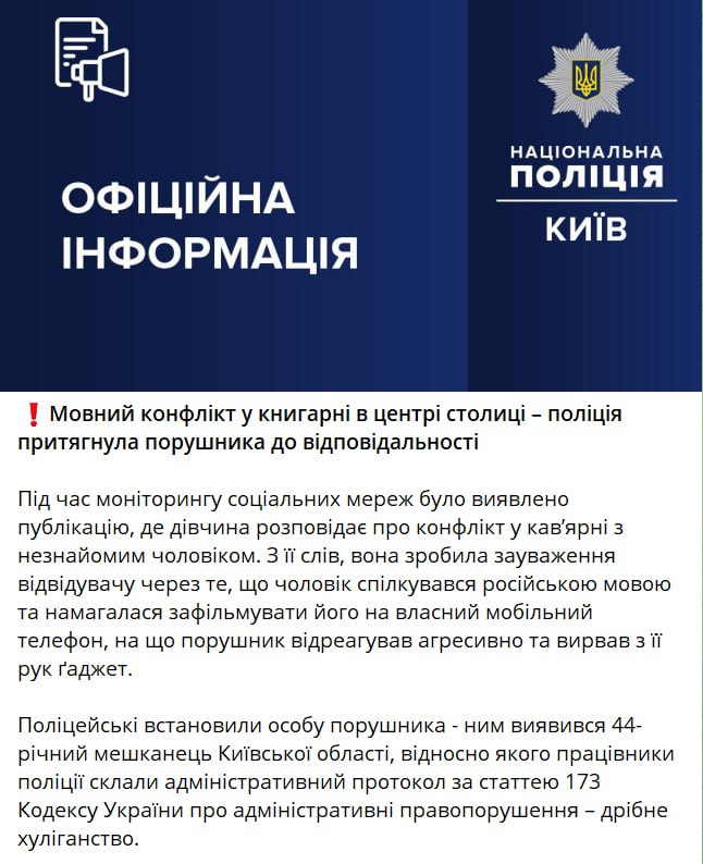 According to the Kyiv police, the "offender" was identified as a 44-year-old resident of the Kyiv region, and the police filed a report against him under Article 173 of the administrative code - "petty hooliganism".