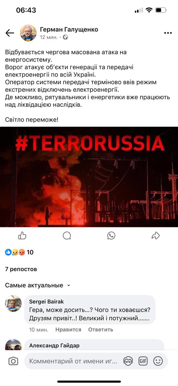 As Herman Halushchenko reported, the transmission system operator immediately implemented emergency power outages.