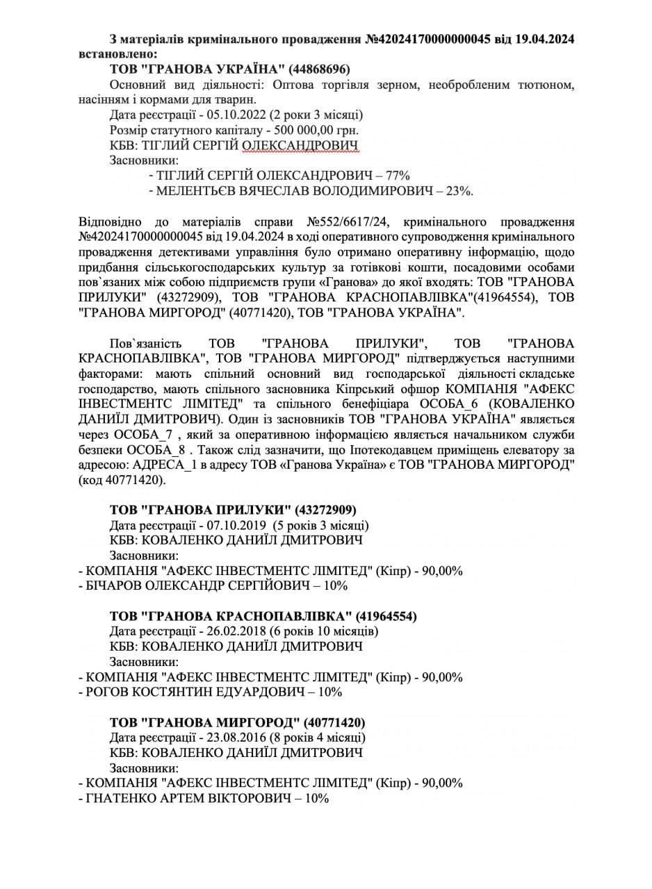 During the period from August 2023 to June 2024, the feed mill sold 14.2 thousand tons of wheat and corn to "Granova Ukraine" for a total of 83 million UAH, of which 10 million UAH was VAT. At the same time, the mill’s reports declared the purchase of 12,400 tons of grain for 74 million UAH (of which 9 million UAH was VAT). As a result, the mill’s details were used to legalize unrecorded grain, facilitating illegal operations for the company "Granova Ukraine."