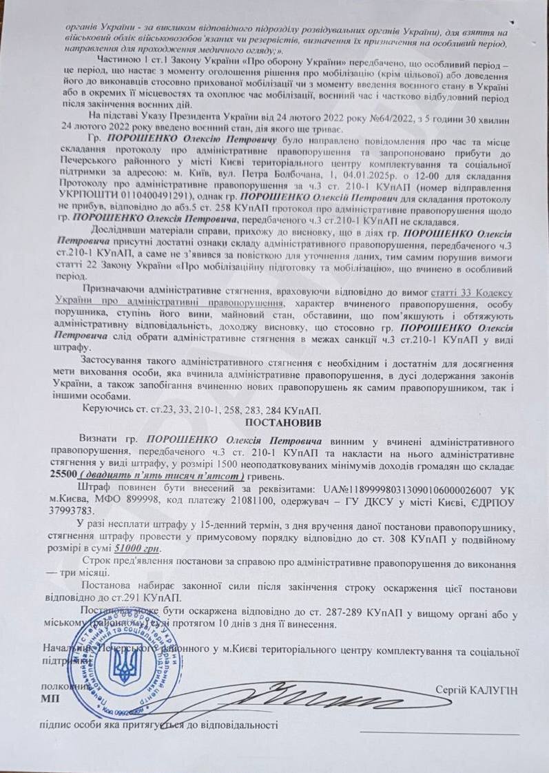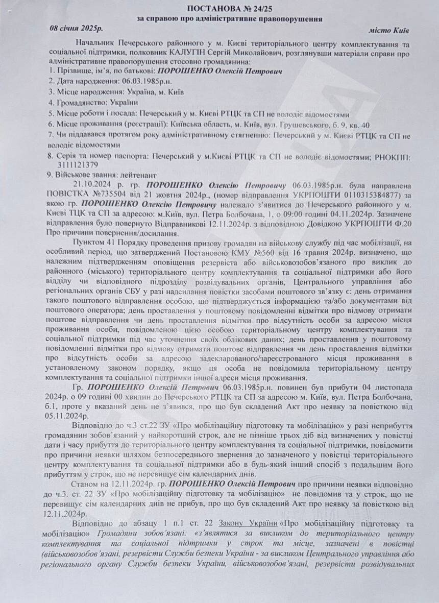 According to the document, he failed to appear without valid reasons at the Pechersk District Military Registration and Enlistment Office in Kyiv to receive a summons for data clarification.