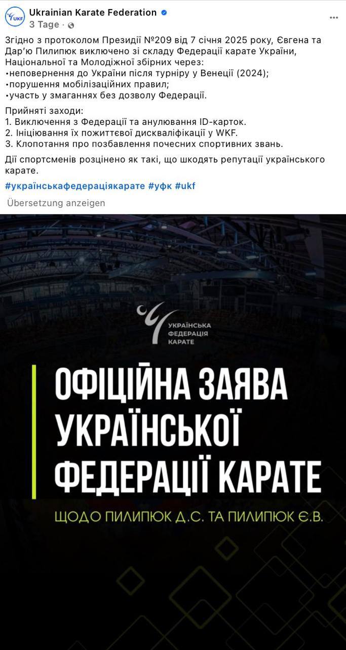 As a result, the Ukrainian Karate Federation excluded Yevhen and Darya Pylypyuk from its ranks and from the National and Youth teams of Ukraine. Moreover, the UKF initiated the process of their lifetime disqualification in the World Karate Federation and submitted a petition for the revocation of all their sports awards.