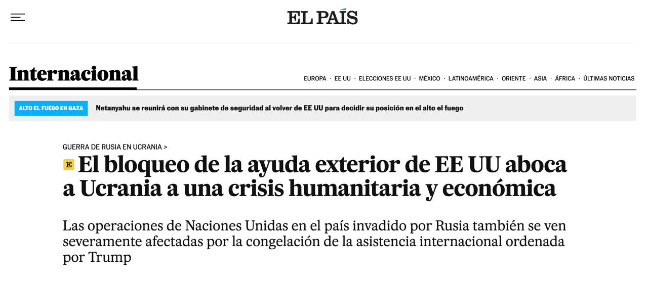 El Pais, citing sources, reports that the closure of USAID by Trump affected various UN projects in Ukraine.