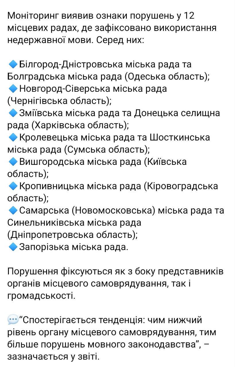 The list of violators includes the city councils of Zaporizhzhya, Kropyvnytskyi, Bilhorod-Dnistrovskyi, and Bolhrad (Odesa region), Novhorod-Siverskyi (Chernihiv region), Samara (Dnipropetrovsk region), Vyshhorod (Kyiv region), and others.