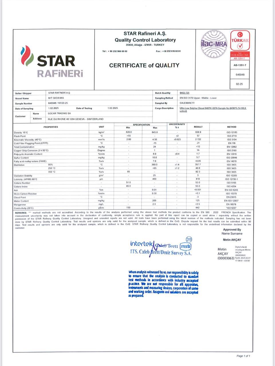 According to the waybill (TNN), the temperature of the diesel shipped on February 7, 2024, was 170°C, whereas typically the fuel temperature is a few degrees higher than the water temperature. As of the day of shipment, February 6, the water temperature in the Black Sea was slightly above 3°C.