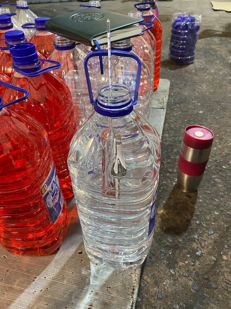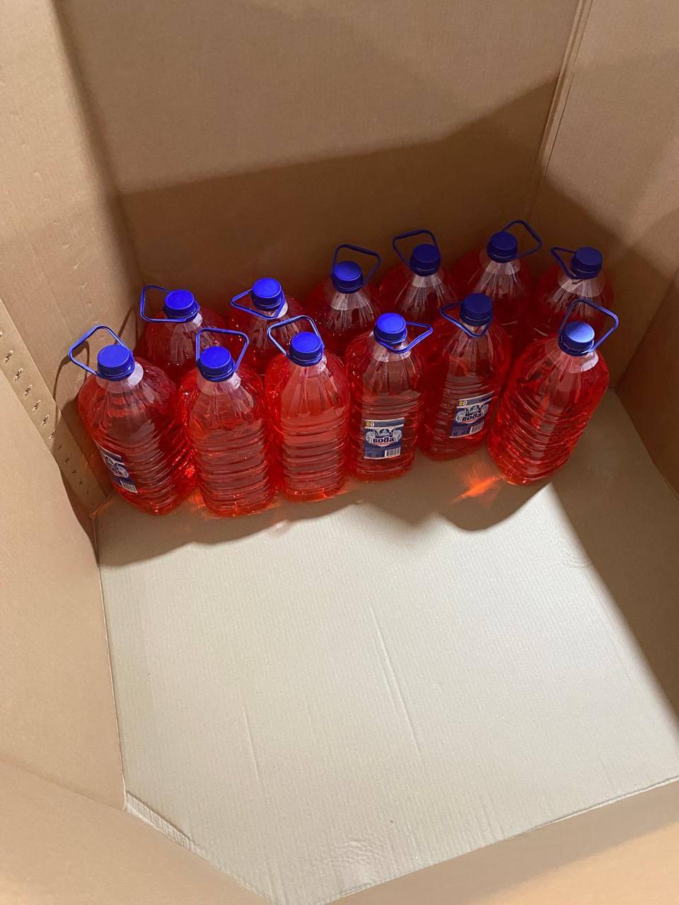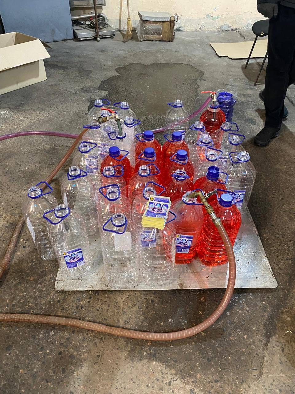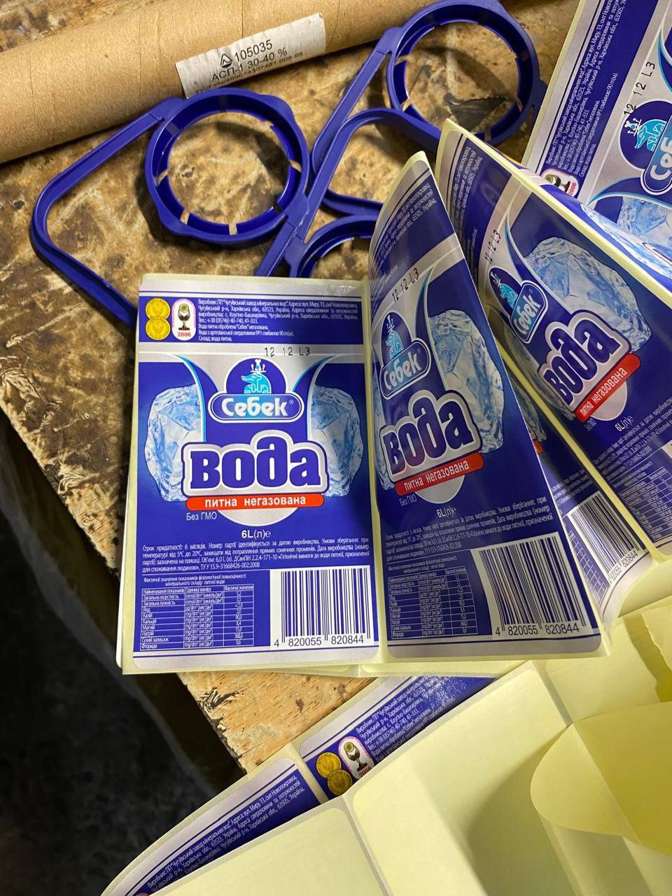 - over 300 plastic 6-liter containers with liquid smelling of alcohol and labeled "Sebeck Water" from PE "Chuhuivskyi Mineral Water Plant";