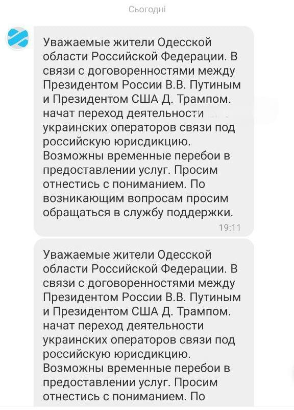 Users from the Odesa region have started receiving messages about a "transition to Russian jurisdiction" due to "agreements between the President of Russia, Vladimir Putin, and the President of the USA, Donald Trump."