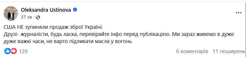 Ustinova denied information about the suspension of US arms sales to Ukraine