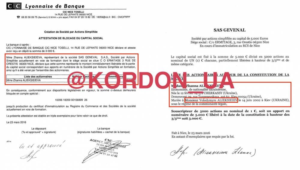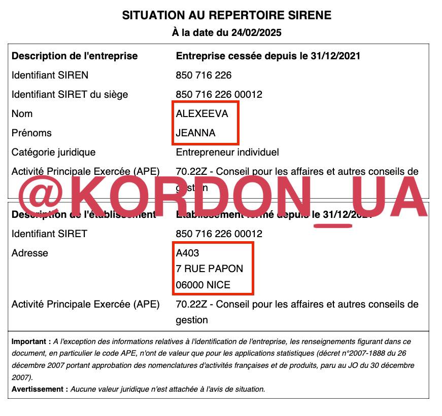 From 2019 to 2021, the wife was an individual entrepreneur in France. She provided consulting services. NACP, check the income? In the registration documents, she is listed as ALEXEEVA JEANNA, with the same residence address as in the previous company. There is no information about this in Alekseev’s declaration.