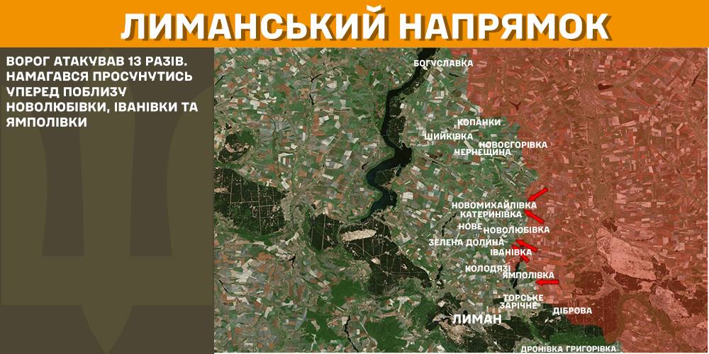 In the Lyman direction the enemy attacked 13 times - attempting to advance near Novolyubivka, Ivanivka, and Yampilivka.